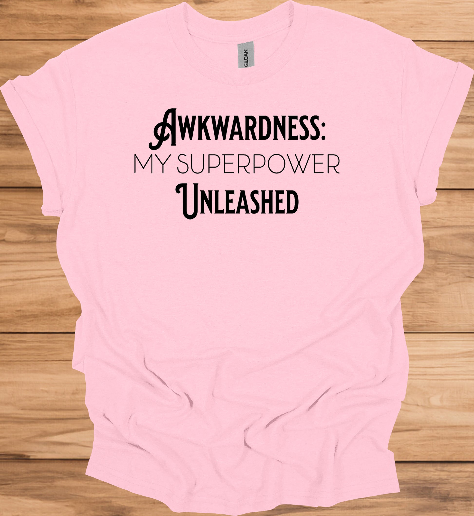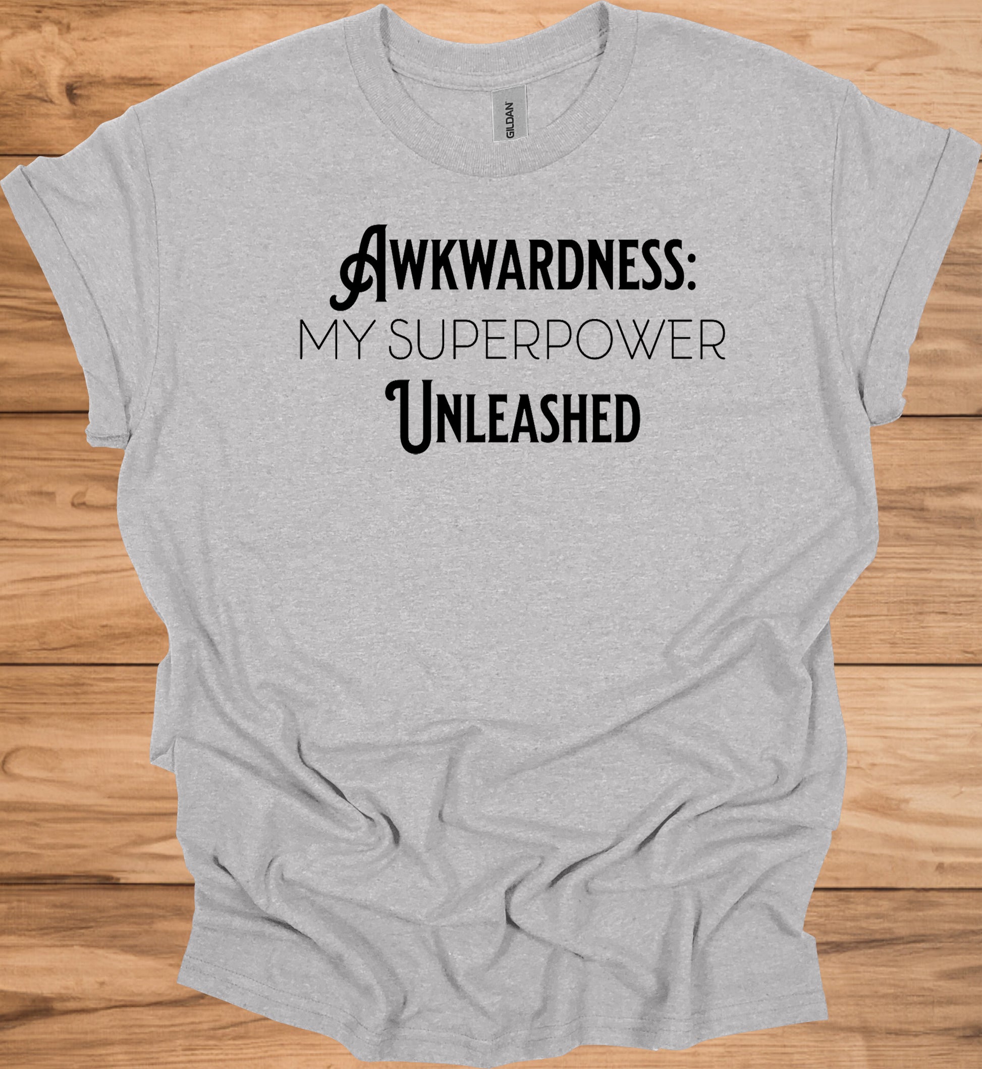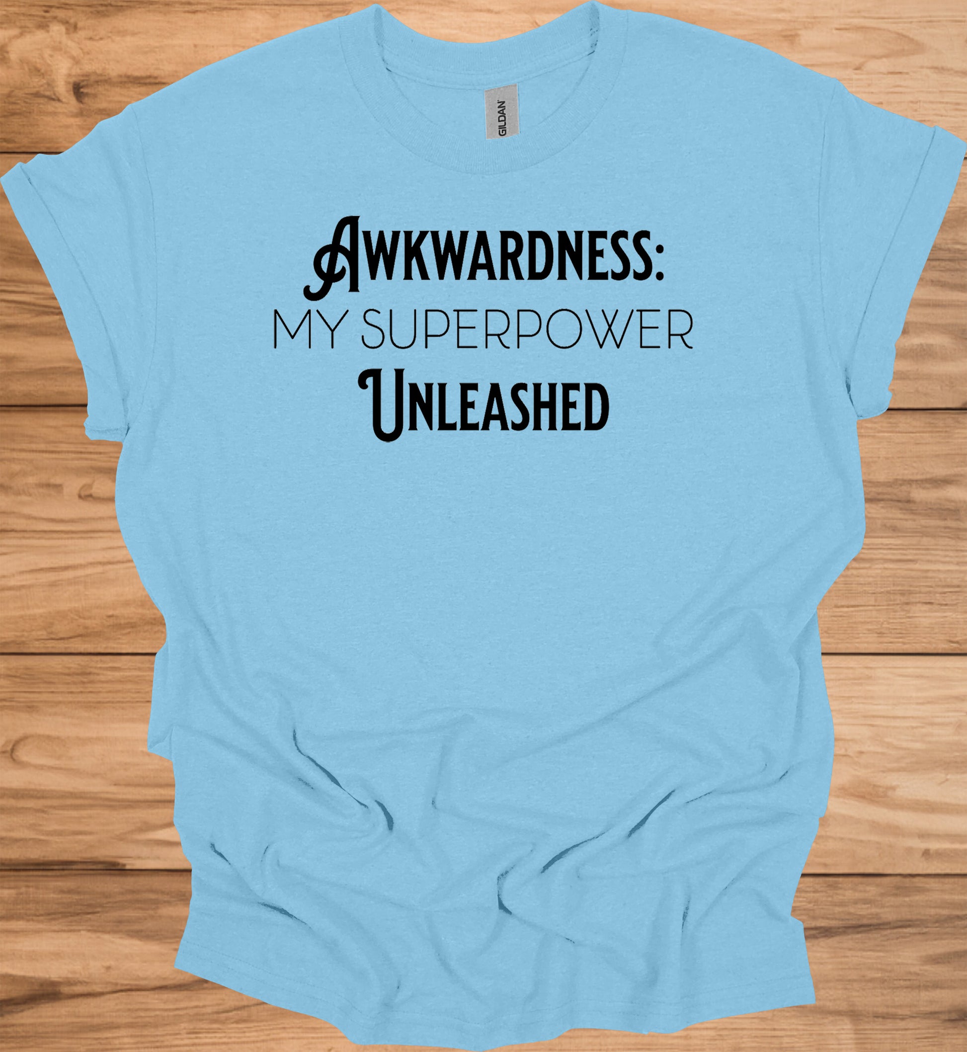 The image displays bold, black text on a transparent background, presenting a powerful message: "AWKWARDNESS: MY SUPERPOWER UNLEASHED". The text is arranged in three lines, with "AWKWARDNESS:" on the top, "MY SUPERPOWER" in the middle, and "UNLEASHED" at the bottom. The typography is sleek and modern, with a mix of serif and sans-serif fonts. The word "AWKWARDNESS" features a decorative musical note at the beginning, adding a unique visual element. The design cleverly transforms a typically negative trait into a source of strength, suggesting empowerment and self-acceptance. The contrast between the words creates a dynamic visual hierarchy, emphasizing the main concept. This image could be used as a motivational graphic, social media post, or part of a larger branding campaign focused on embracing one's quirks and turning perceived weaknesses into strengths.