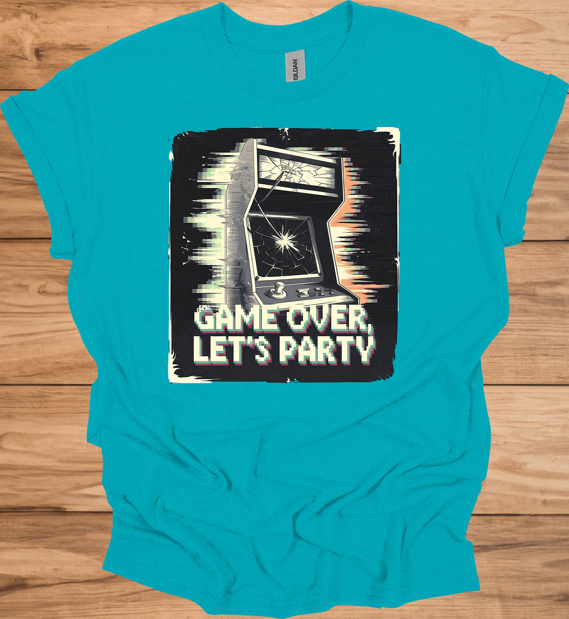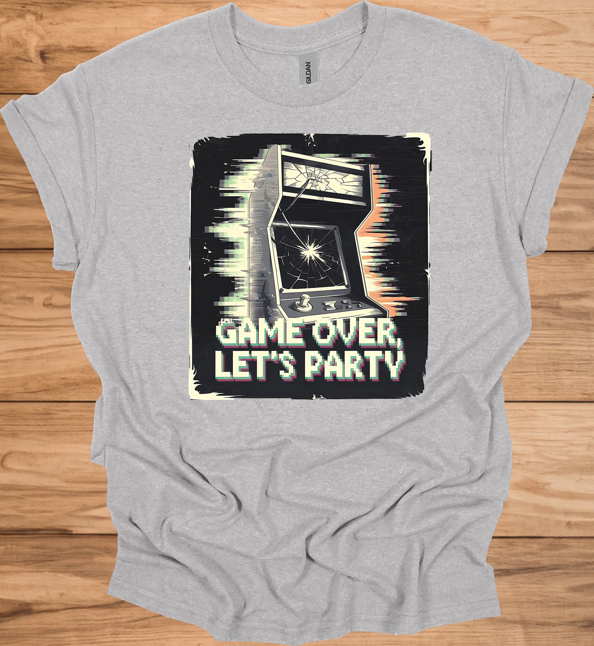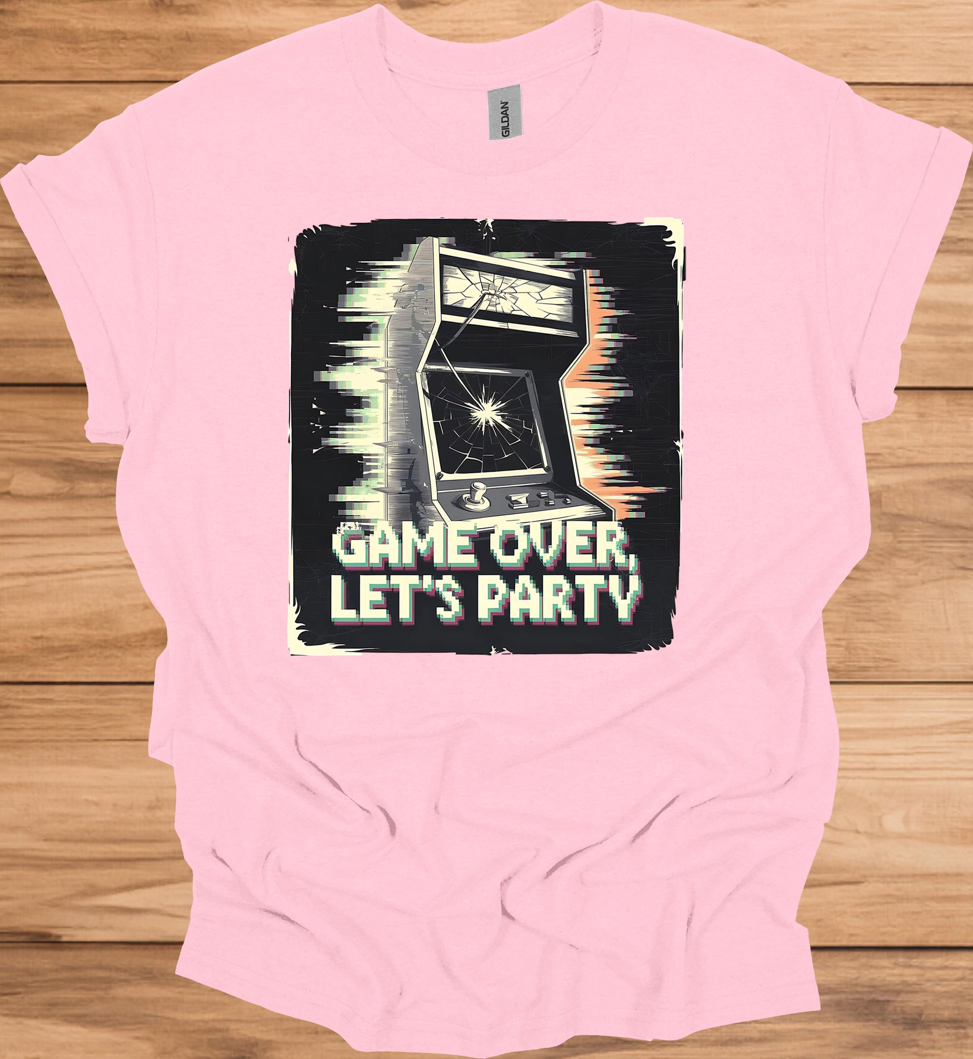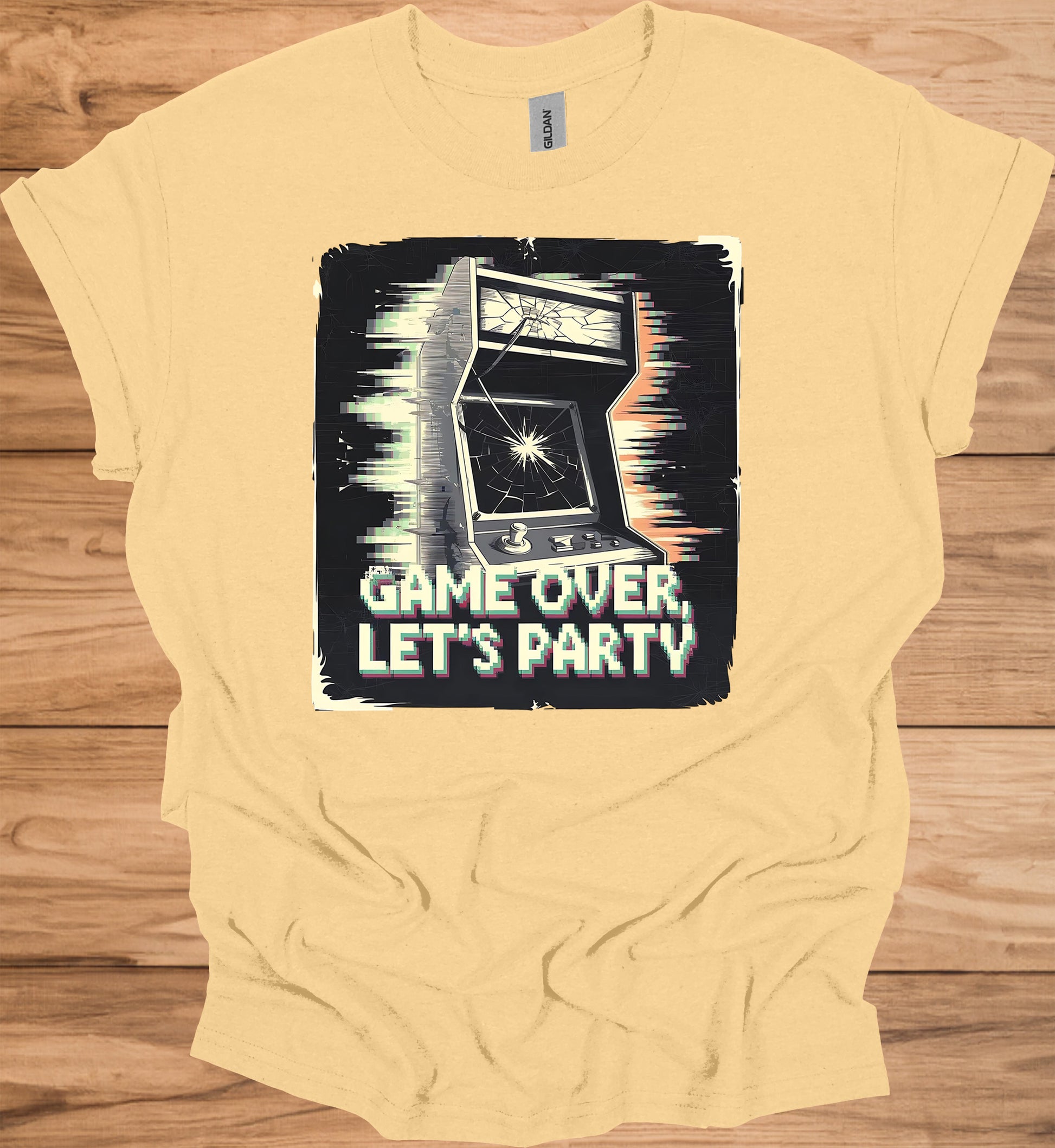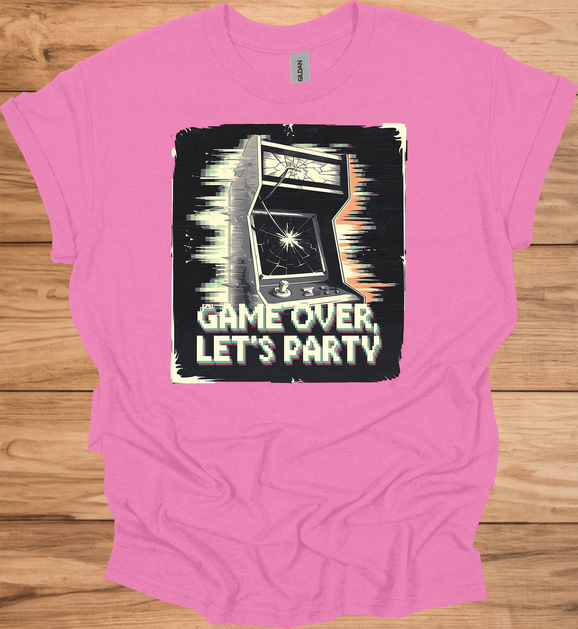 This retro-style image showcases a broken arcade game cabinet with a glitchy, pixelated aesthetic. The screen displays a cracked and shattered effect, symbolizing the end of a game or the destruction of the gaming interface. Below the screen, a joystick and buttons are visible, typical of classic arcade machines. The phrase "GAME OVER, LET'S PARTY" is prominently displayed at the bottom in a pixelated font, suggesting a transition from gaming to celebration. The overall design incorporates glitch art elements, with distorted edges and color anomalies around the cabinet. The color palette is predominantly black and white with subtle hints of green and orange, giving it a nostalgic yet contemporary feel. This striking image would appeal to retro gaming enthusiasts and digital art fans alike, making it perfect for social media posts, gaming websites, or as artwork for events blending gaming culture with party themes.