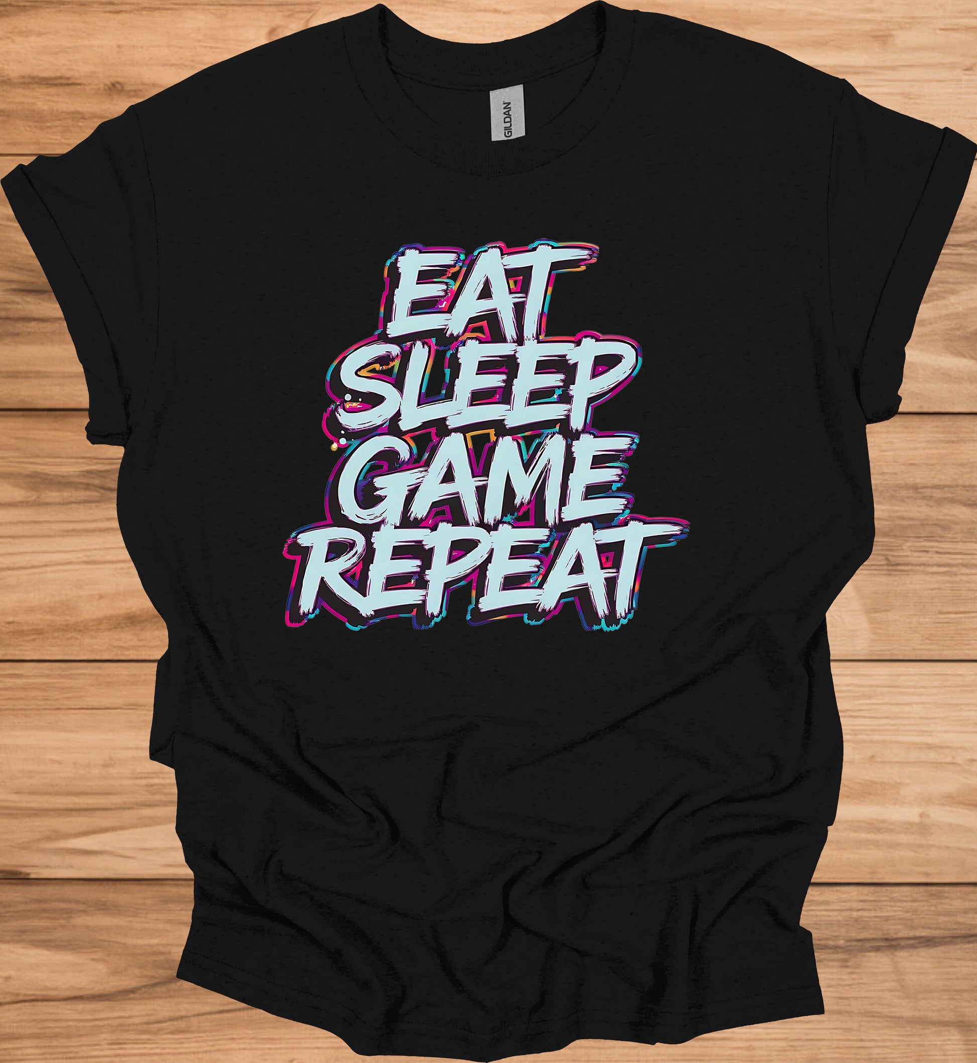 This eye-catching image features bold typography displaying the phrase "EAT SLEEP GAME REPEAT" in a vibrant, graffiti-inspired style. The text is rendered in shades of light blue and white, with colorful outlines in purple, pink, and teal creating a striking 3D effect. The letters have a rough, hand-drawn appearance, giving the design an edgy, urban feel. The words are stacked vertically, filling the entire frame against a black background for maximum contrast. This design would appeal to gamers and gaming enthusiasts, encapsulating the dedicated lifestyle of those passionate about video games. The repeating cycle of eating, sleeping, and gaming speaks to the immersive nature of gaming culture. The dynamic, energetic style of the typography reflects the fast-paced, exciting world of gaming. Overall, this image serves as a powerful visual representation of gaming dedication and could be effectively used on merchandise, posters, or social media content for gaming-related brands or events.