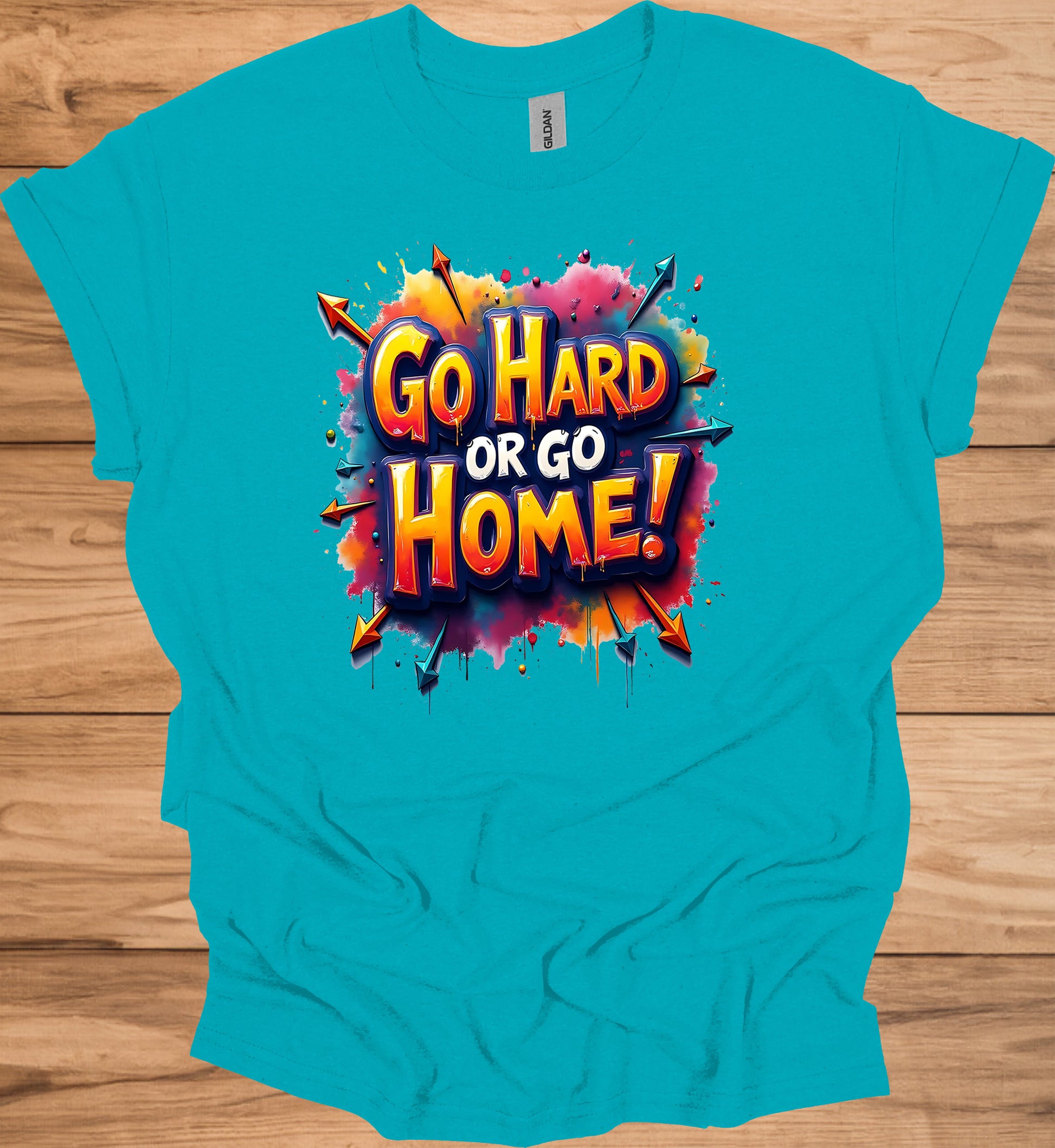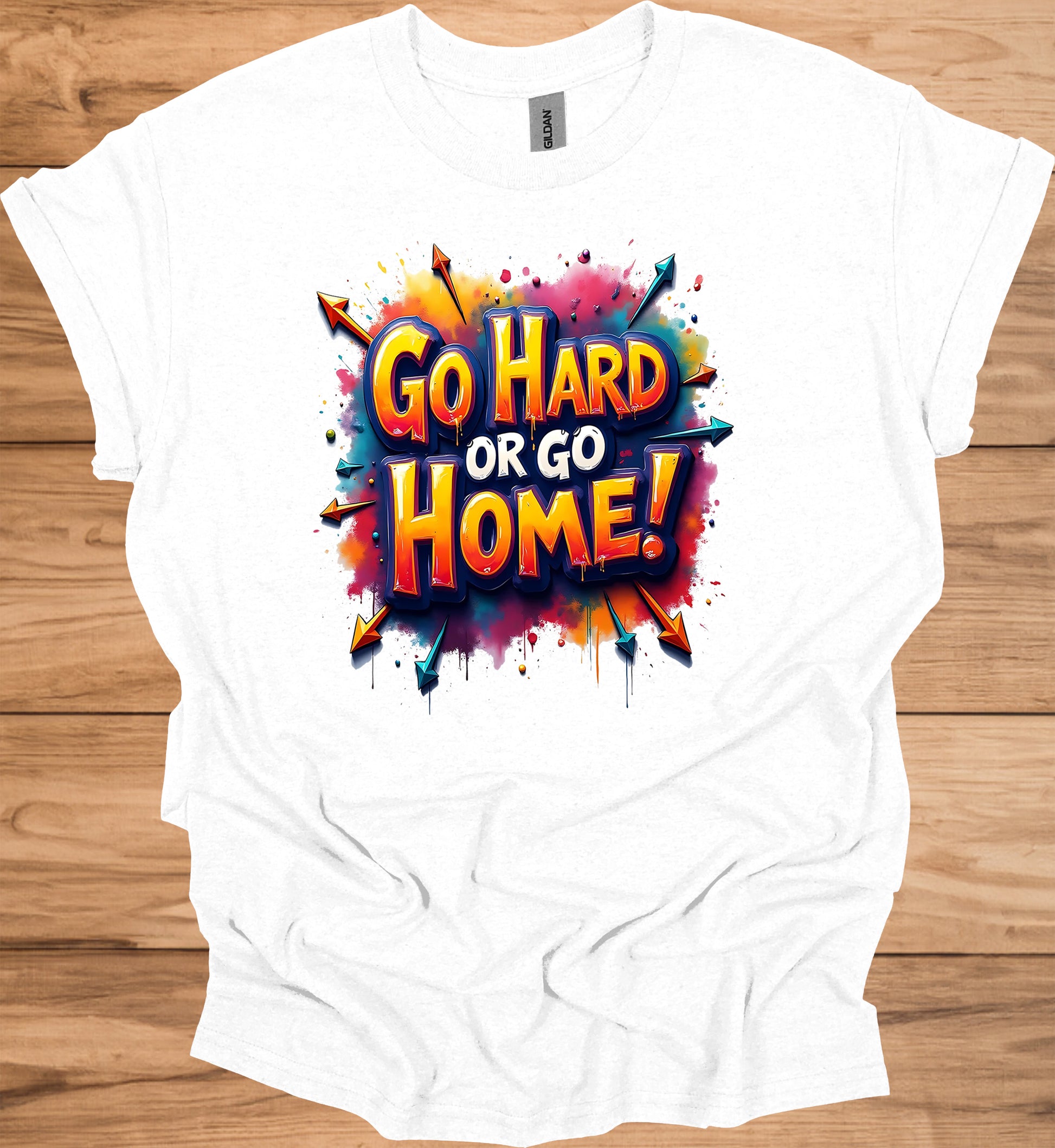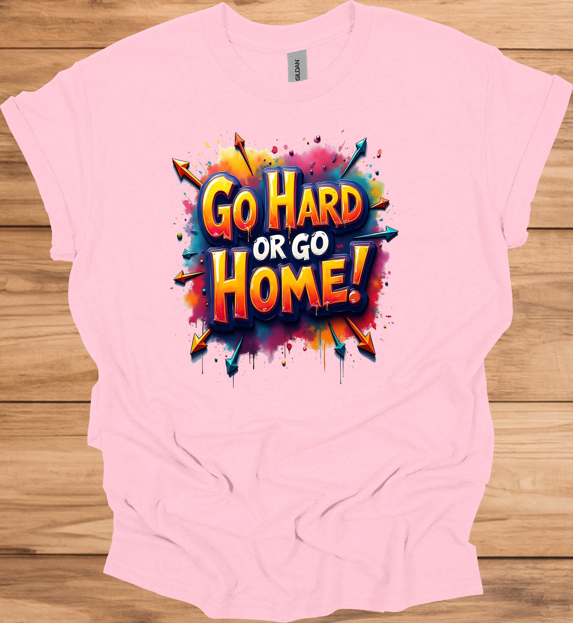 This vibrant image showcases a bold and colorful typographic design featuring the phrase "Go Hard or Go Home!" The text is rendered in a dynamic 3D style with gradients of yellow, orange, and blue. The background explodes with a splash of vivid colors including pink, yellow, blue, and orange, creating a energetic and eye-catching effect. Surrounding the text are various geometric shapes, primarily arrows pointing outward, emphasizing the motivational message. The overall style resembles graffiti or street art, with a grungy, spray-painted texture. Small paint splatters and pixel-like elements add to the dynamic, urban feel of the composition. The contrast between the bold text and the colorful background makes the message pop, ensuring it catches the viewer's attention. This image would be ideal for motivational posters, social media content, or as part of a fitness or sports-related campaign.