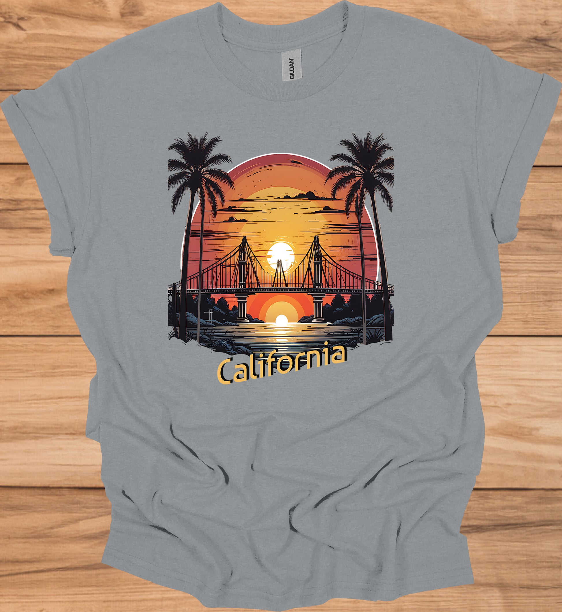 This vibrant image captures the essence of California's iconic landscape and architecture. The focal point is a majestic suspension bridge, reminiscent of the Golden Gate Bridge, silhouetted against a dramatic sunset sky. Palm trees frame the scene, adding a tropical flair typical of California's coastal regions. The sun, a brilliant orb, descends between the bridge's towers, casting a golden glow across the water. Layers of warm colors - deep reds, oranges, and yellows - paint the sky, creating a breathtaking backdrop. The reflection of the sunset and bridge in the calm waters below adds depth and symmetry to the composition. In the foreground, rocky outcrops and vegetation suggest a rugged coastline. The circular border gives the image a retro postcard feel, while the stylized "California" text at the bottom reinforces its travel poster aesthetic. This eye-catching design effectively encapsulates the allure of the Golden State, showcasing its natural beauty and man-made wonders in a single, striking image.