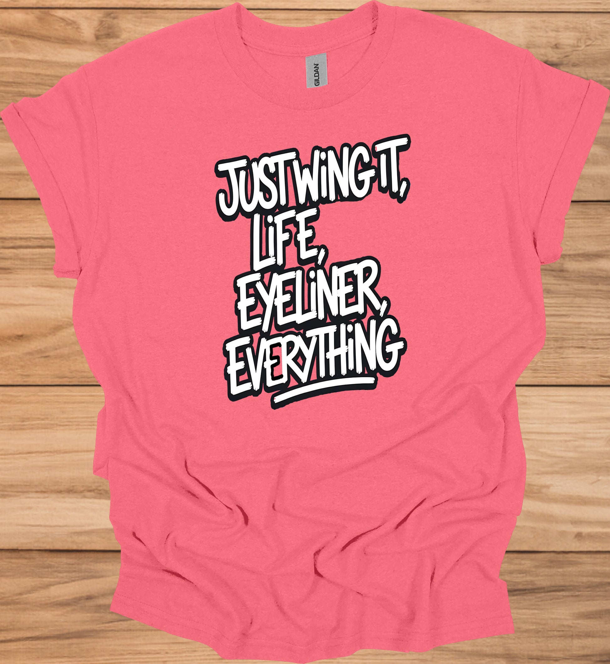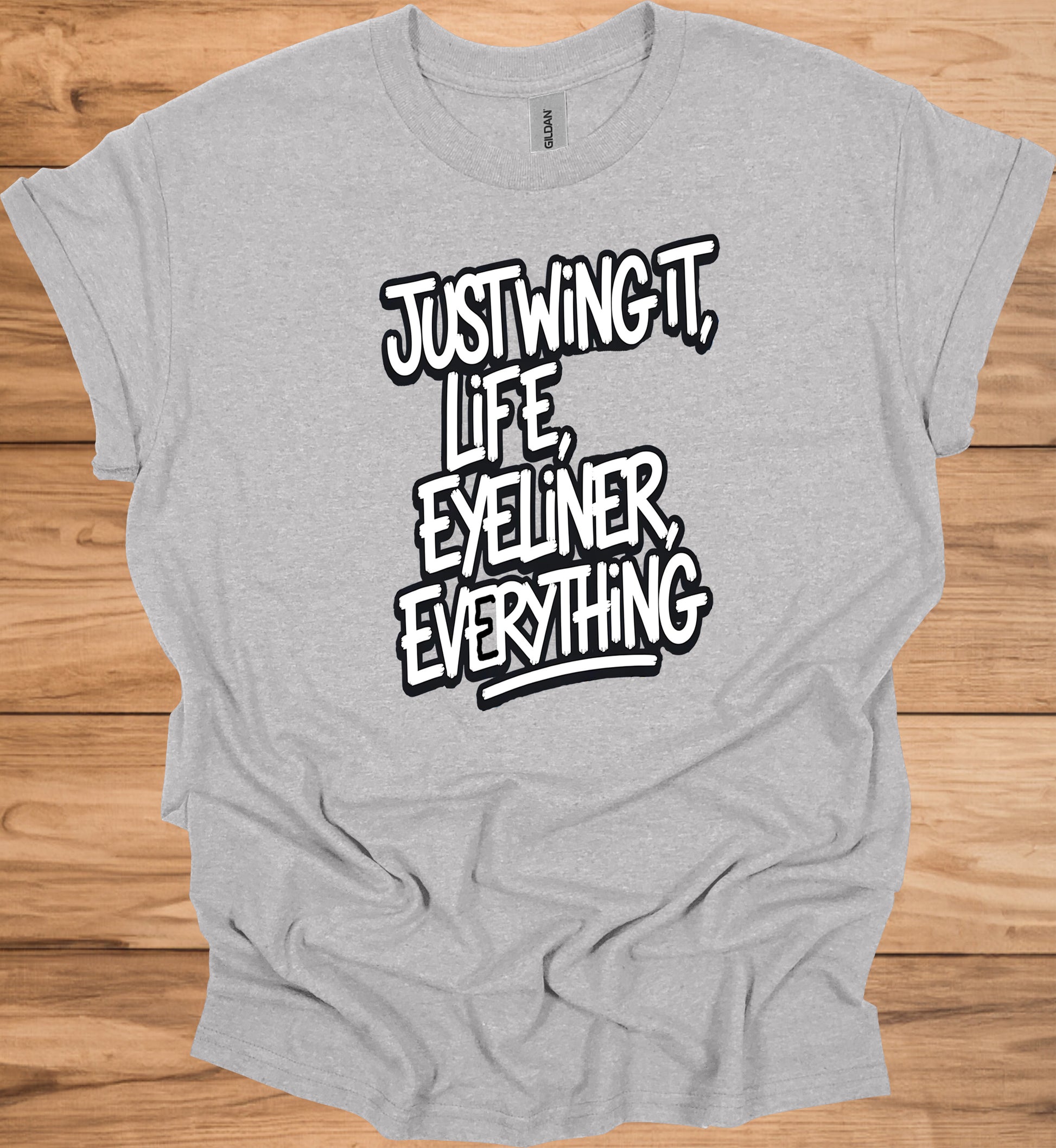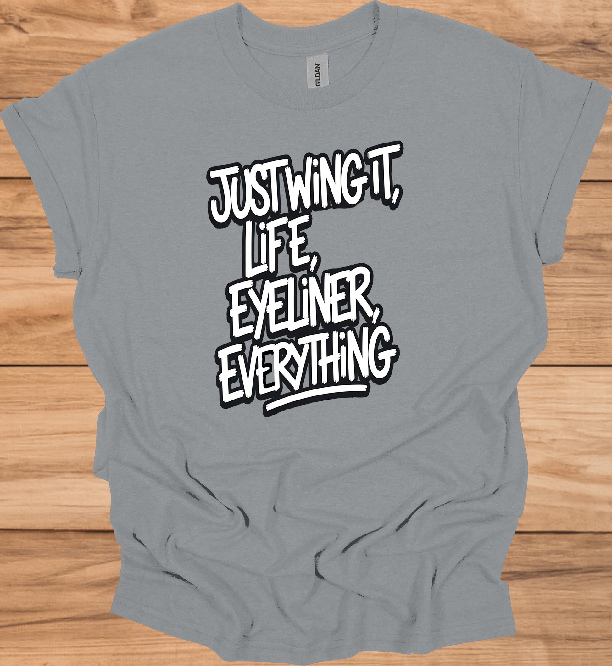 This image features bold white text on a black background, displaying the phrase "JUST WING IT, LIFE, EYELINER, EVERYTHING" in a stylized, hand-drawn typography. The text is arranged in a stacked format, with each line slightly larger than the one below it, creating a dynamic visual hierarchy. The lettering has a rough, brushstroke-like quality, giving it a casual and energetic feel. The words are outlined in black, enhancing their readability and adding depth to the design. This quote combines humor and advice, relating the act of applying eyeliner to broader life experiences. The stark contrast and eye-catching design make this image suitable for social media posts, motivational posters, or beauty-related content. Its message encourages a carefree, improvised approach to both makeup application and life challenges. The overall aesthetic is modern, youthful, and slightly edgy, appealing to those who appreciate bold, text-based graphic design.