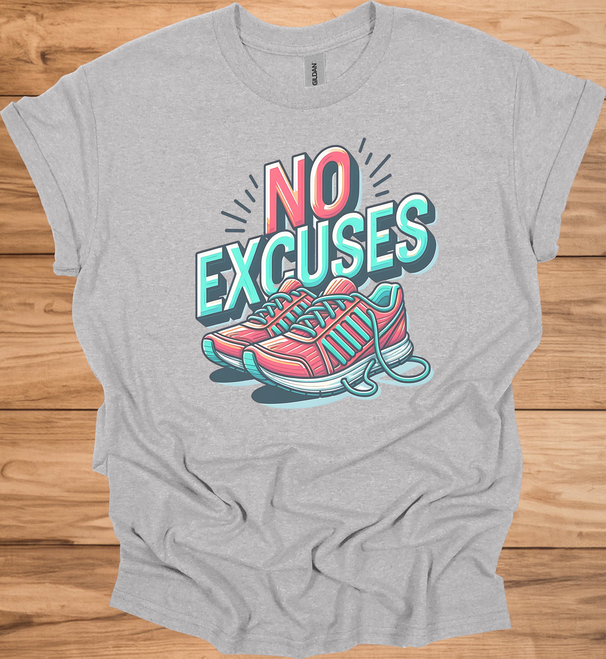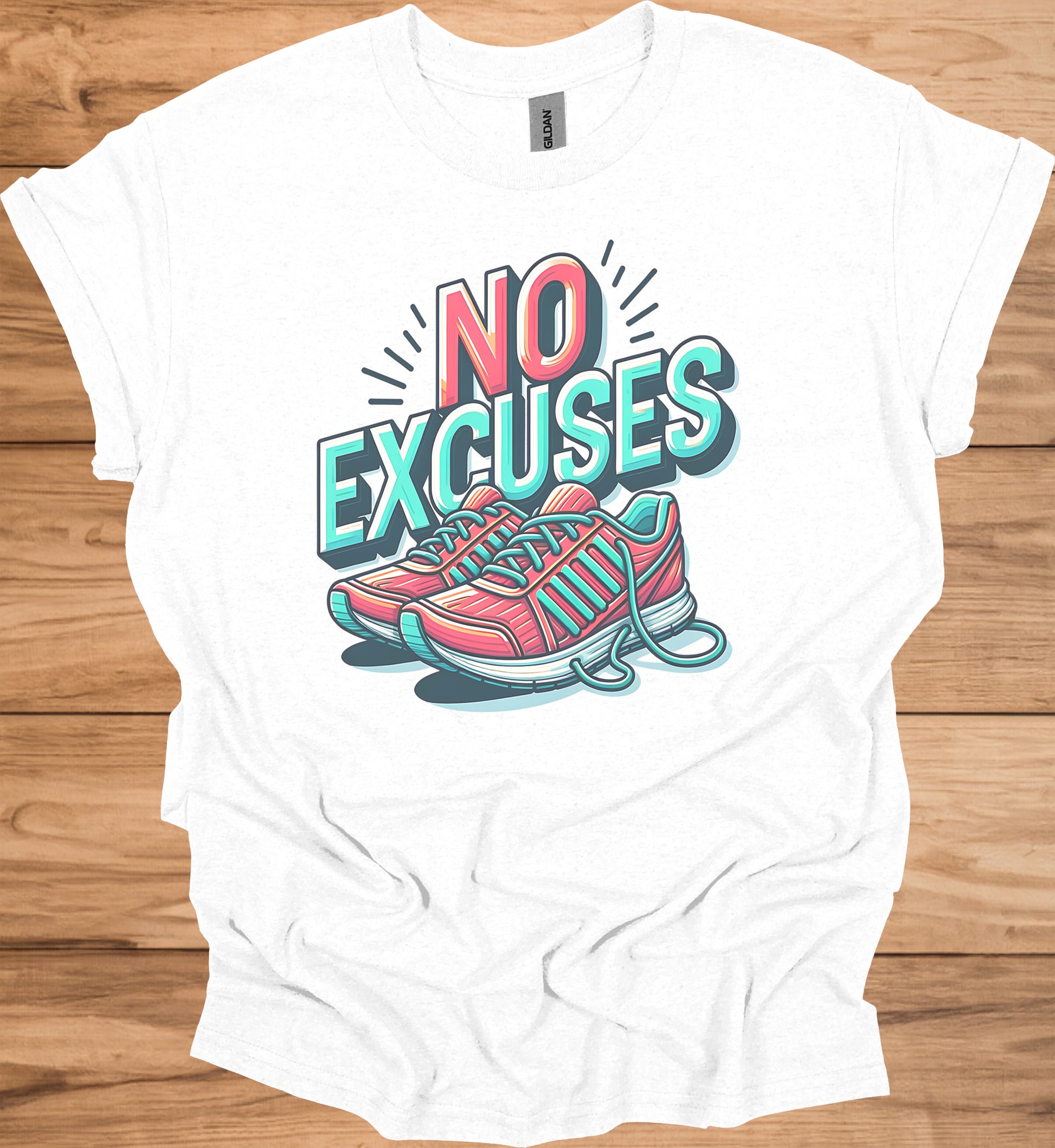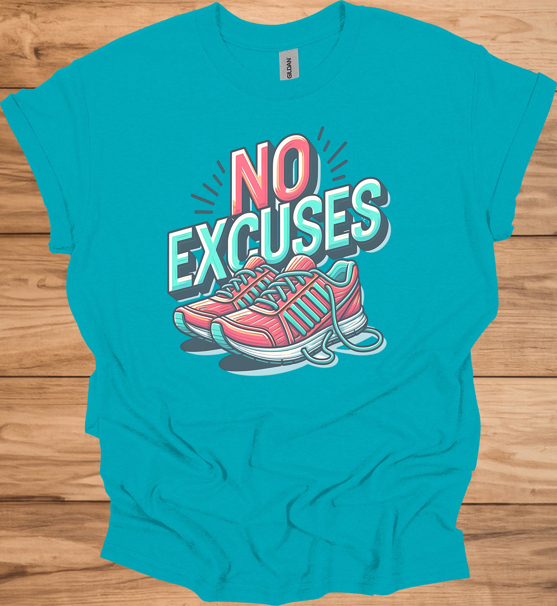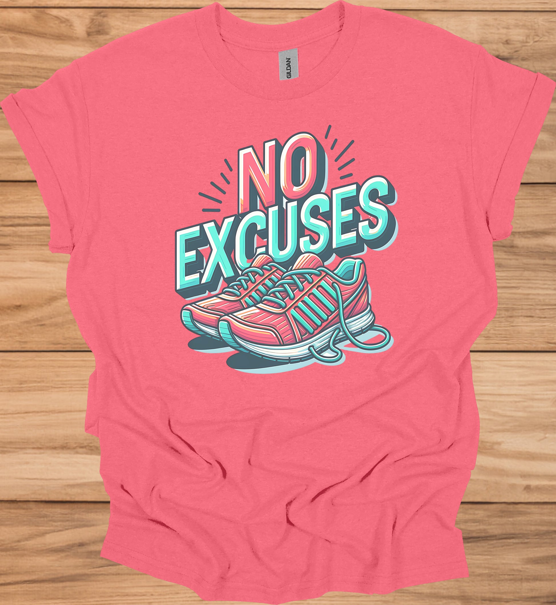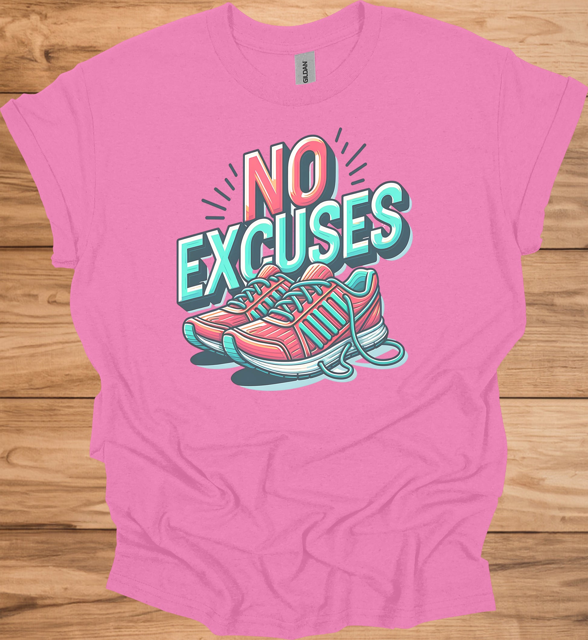 This vibrant image showcases a motivational fitness-themed design featuring the bold text "NO EXCUSES" in 3D lettering. The words are rendered in eye-catching pink and teal colors, creating a striking contrast against a dark background. Below the text, a pair of stylized running shoes is prominently displayed, reinforcing the message of determination and exercise. The sneakers are illustrated in a dynamic, cartoon-like style with exaggerated details and a color palette matching the text above. Small radiating lines around the "NO" add emphasis and energy to the overall composition. The design cleverly combines typography and illustration to create a powerful visual statement encouraging physical activity and commitment to fitness goals. Its bold colors and modern aesthetic make it ideal for social media posts, fitness apps, or motivational posters aimed at inspiring people to stay active and overcome obstacles in their exercise routines.