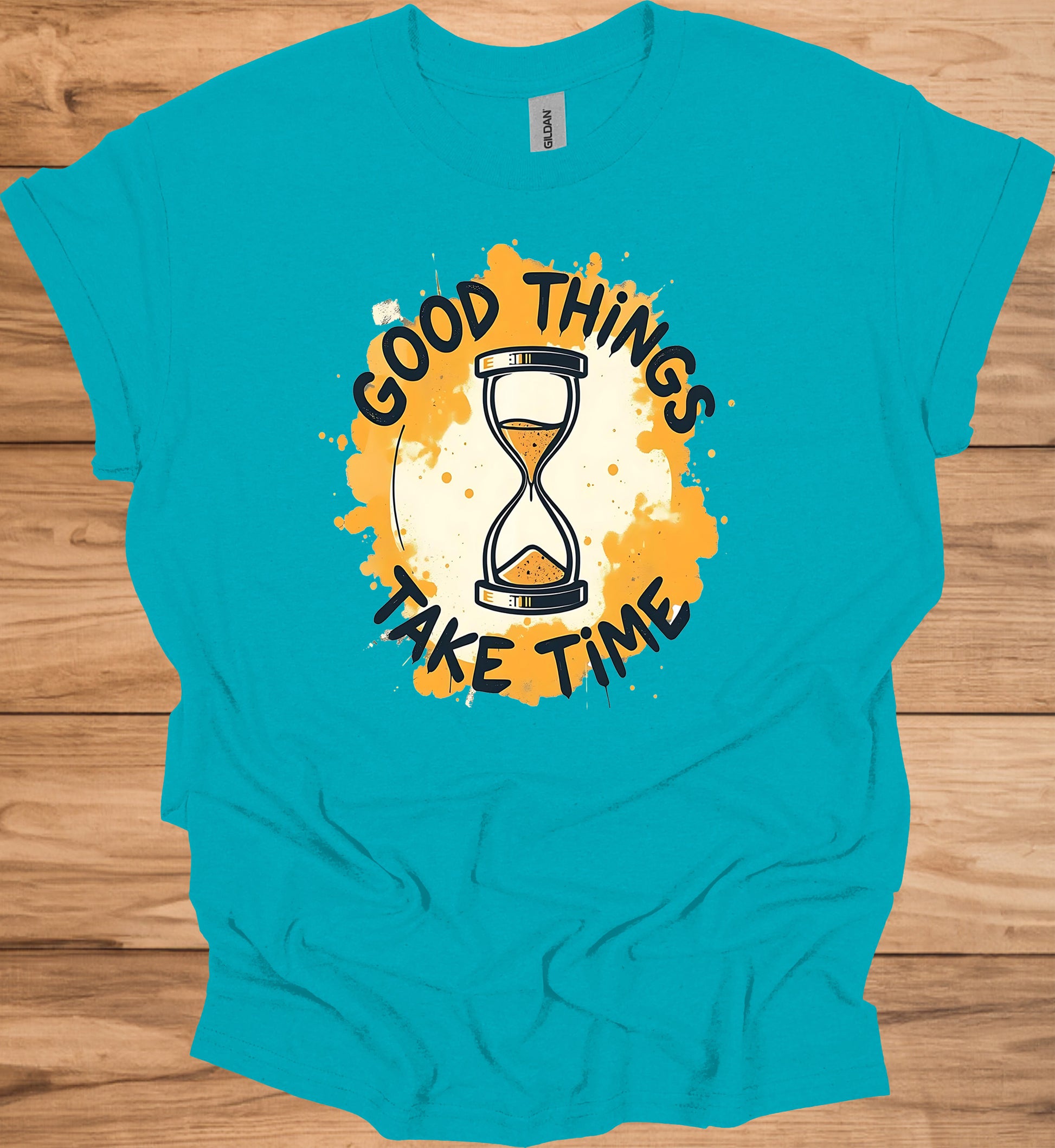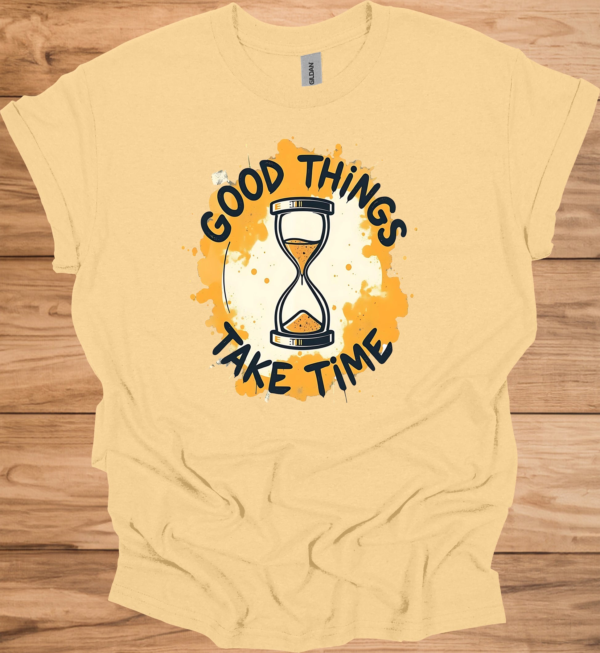 This eye-catching image features the motivational phrase "Good things take time" wrapped around a stylized hourglass. The design uses a vibrant orange and black color scheme, creating a bold contrast. The hourglass, centrally placed, contains orange sand symbolizing the passage of time. Surrounding the hourglass is an energetic splash of orange paint, giving the image a dynamic feel. The text is presented in a playful, graffiti-like font that adds to the overall modern and youthful aesthetic. The background is predominantly white, making the orange elements pop even more. This image would be perfect for social media posts, motivational posters, or as part of a brand's visual identity focused on patience and perseverance. It effectively communicates the idea that success and achievement often require time and dedication. The design's simplicity and strong visual impact make it highly shareable and memorable.