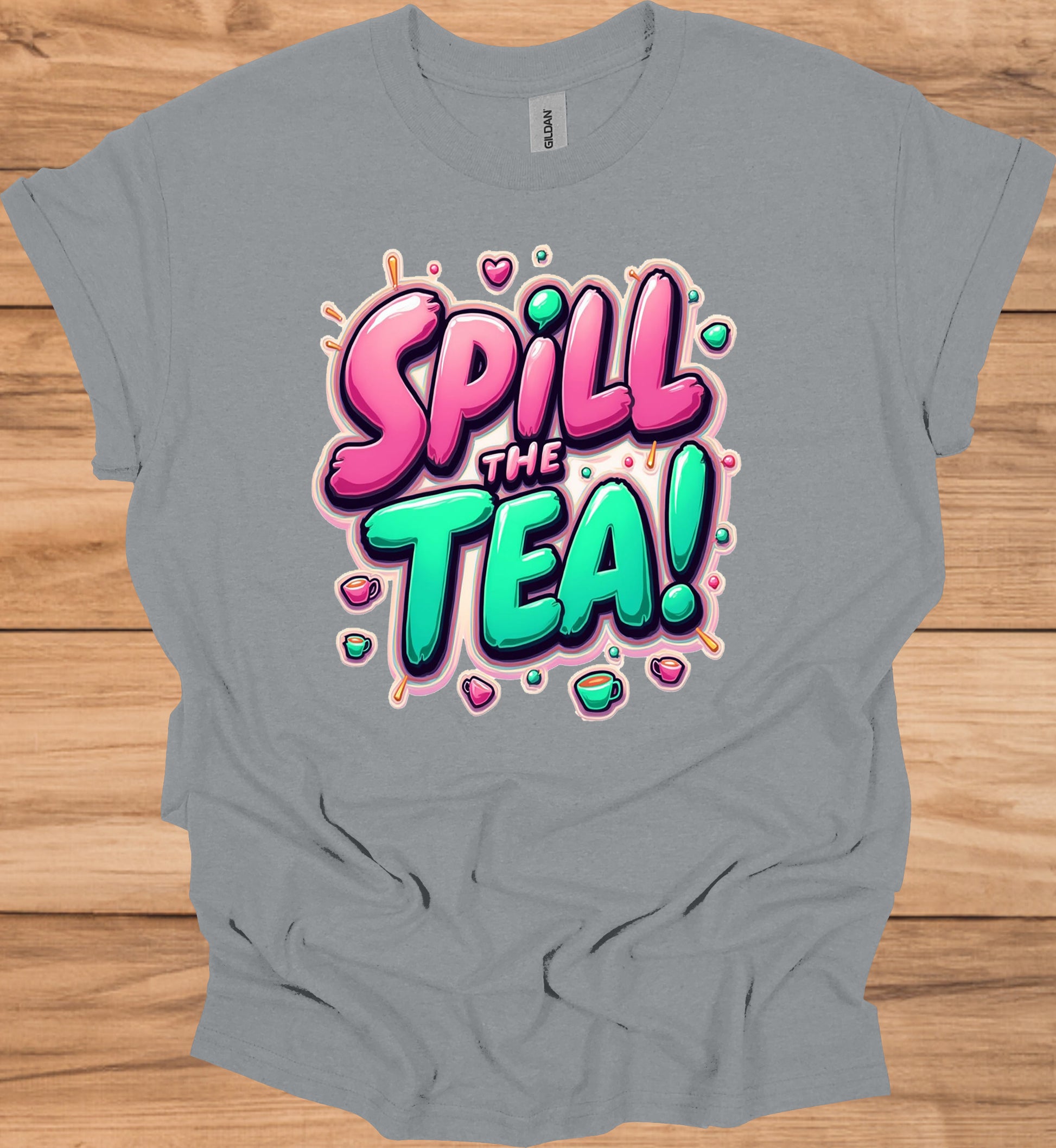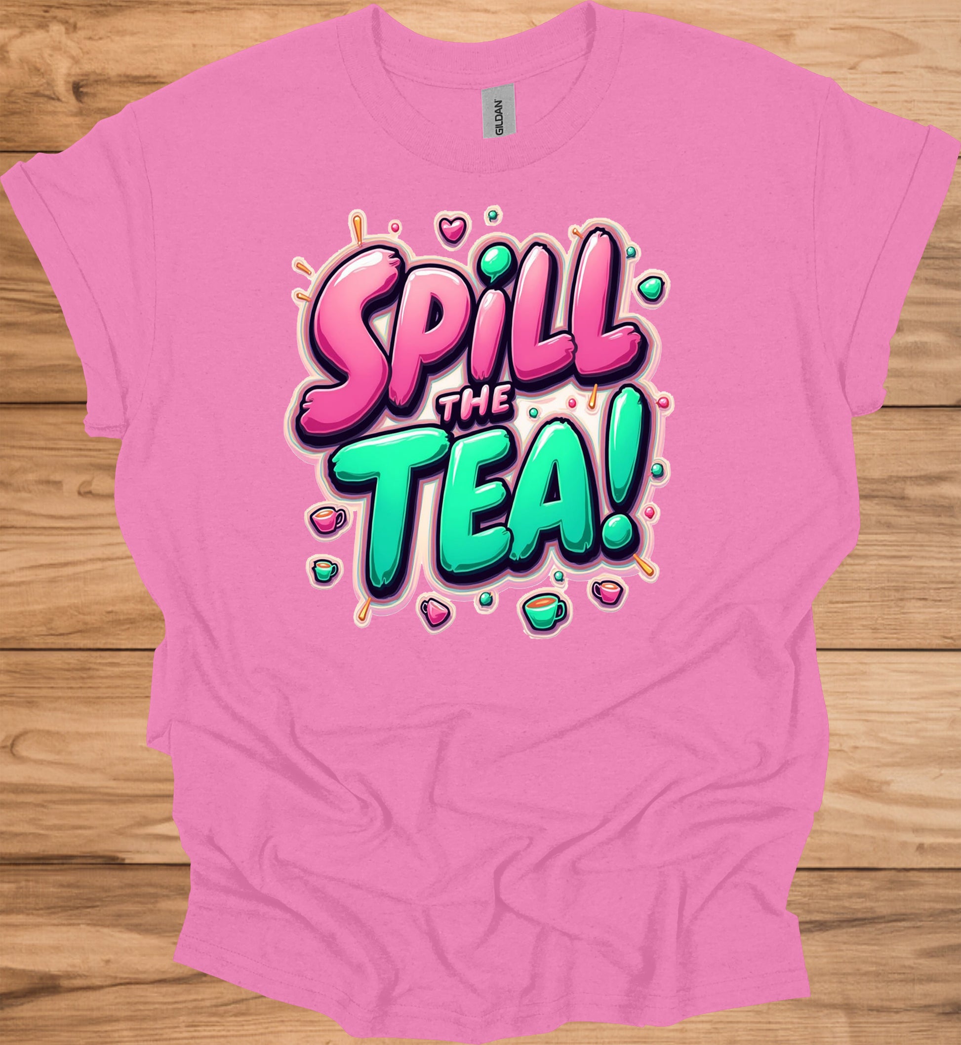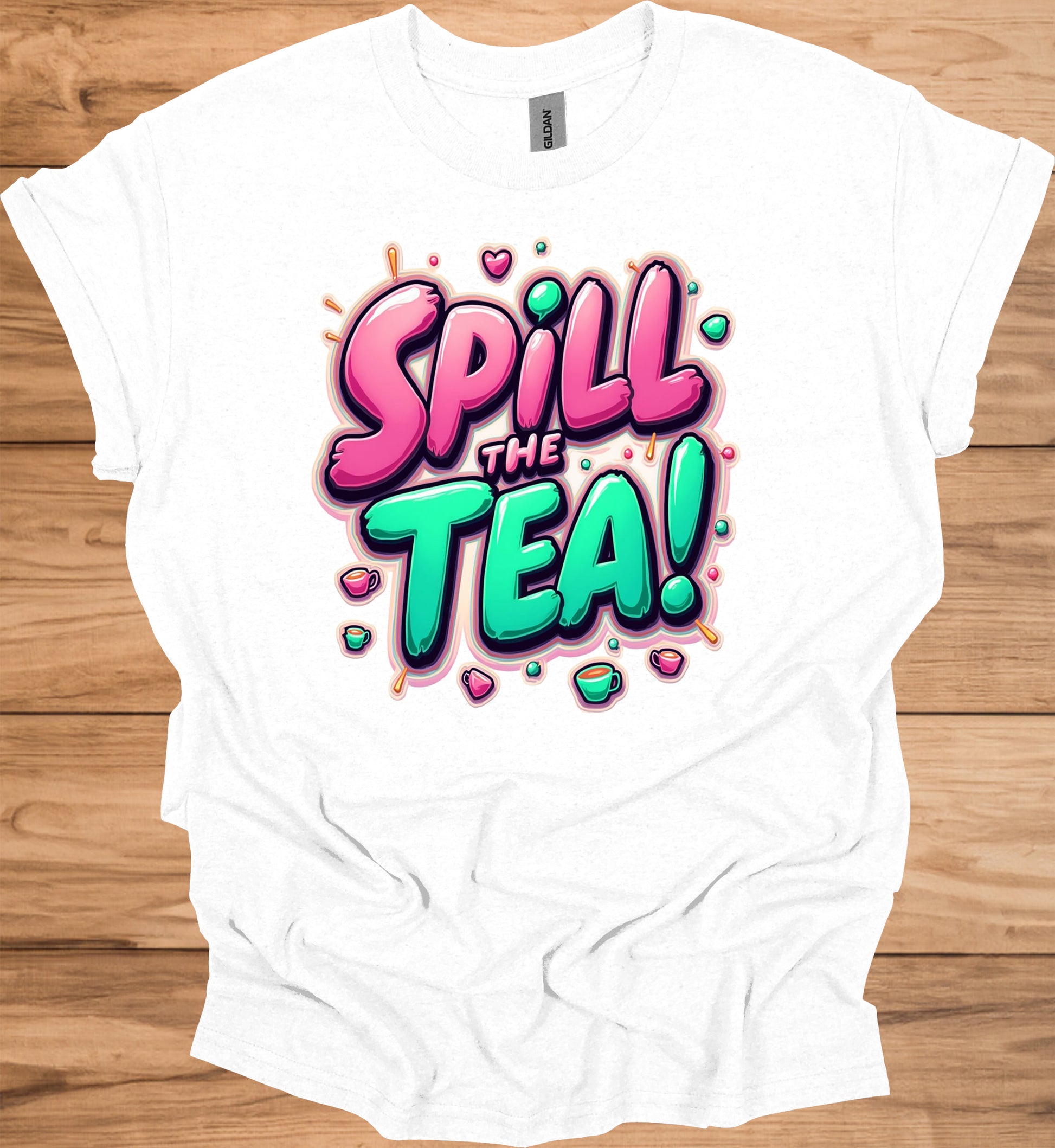 This vibrant and eye-catching image features the phrase "Spill the Tea!" in bold, colorful lettering. The words "Spill" are written in a playful, bubbly pink font, while "the Tea" is displayed in a bright teal color. The design is adorned with various decorative elements, including small hearts, tea cups, and droplet shapes in complementary colors. The overall style is reminiscent of graffiti or street art, with a glossy, three-dimensional effect that makes the text pop against the background. The image conveys a sense of excitement and gossip, as "spill the tea" is a popular slang phrase meaning to share juicy information or gossip. The color scheme of pink and teal creates a lively, modern aesthetic that's likely to appeal to a younger audience. This graphic would be perfect for social media posts, blog headers, or merchandise related to casual conversation or entertainment topics.