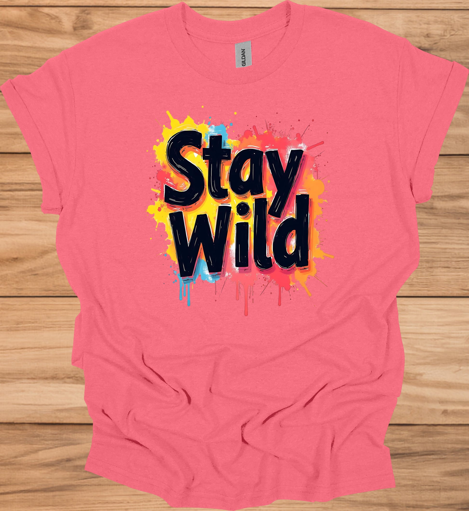 The image showcases a vibrant and energetic typographic design featuring the phrase "Stay Wild" in bold, black letters. Set against a dynamic background of colorful paint splashes and splatters, the text pops with a rebellious and adventurous spirit. The color palette is dominated by vivid yellows, reds, and touches of blue, creating a striking contrast with the black lettering. The style evokes a sense of graffiti art or street culture, with its explosive and uncontained aesthetic. Paint drips and splatters extend beyond the main text, adding to the wild and untamed feel of the design. The typography itself has a hand-drawn quality, with slight imperfections that enhance its organic appeal. This eye-catching graphic would be well-suited for youth-oriented products, adventure brands, or as motivational artwork. The composition fills the entire frame, making it visually impactful and attention-grabbing. Overall, the image powerfully communicates a message of embracing freedom, spontaneity, and an untamed approach to life.