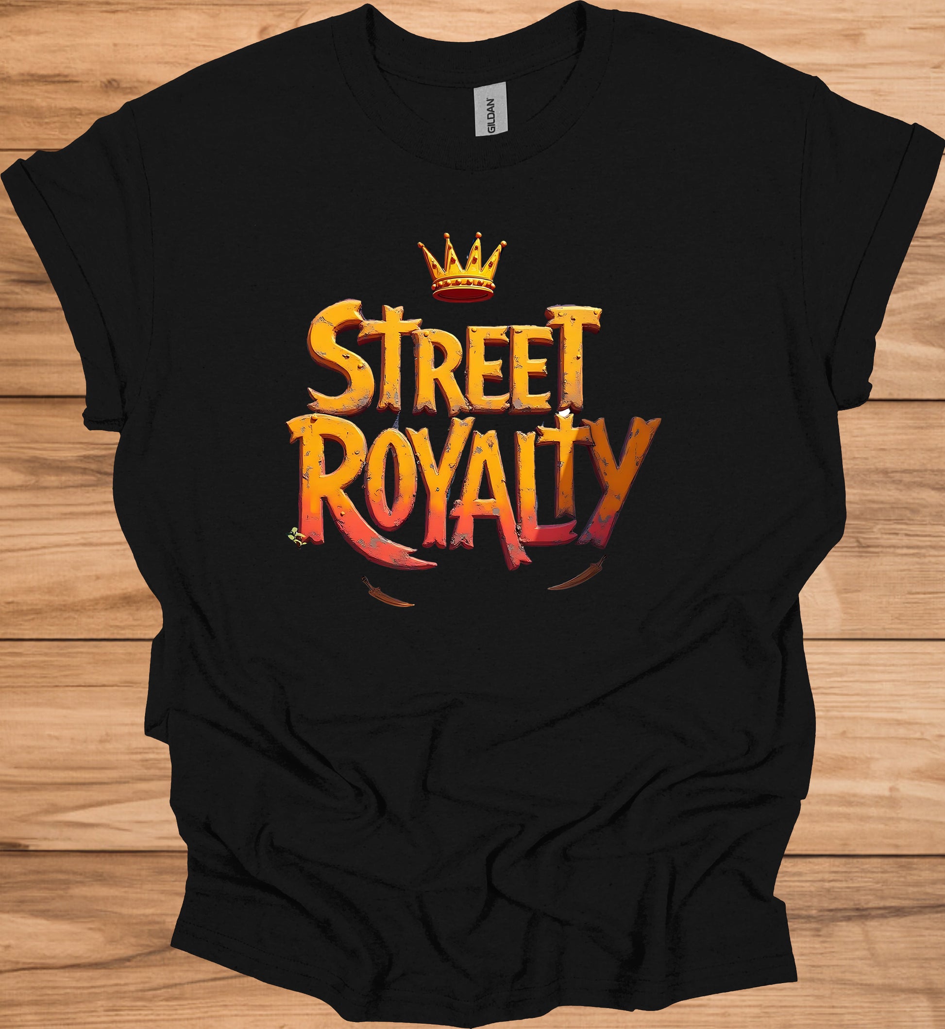 The image showcases a bold, 3D-style logo for "Street Royalty" against a black background. The text is rendered in vibrant golden-orange hues, with a gradient effect that transitions from yellow to deep orange. The lettering has a weathered, textured appearance, giving it a gritty, urban feel. Above the text, a golden crown symbol floats, emphasizing the "royalty" aspect of the brand. The crown features pointed tips and jewel-like embellishments, adding a touch of regality to the overall design. Below the main text, small decorative elements resembling leaves or thorns can be seen, further enhancing the street-inspired aesthetic. The entire composition exudes a sense of urban cool and street credibility. The bold, eye-catching design would be well-suited for branding related to street culture, hip-hop, or urban fashion. The contrasting colors and dimensional effect make the logo visually striking and memorable.