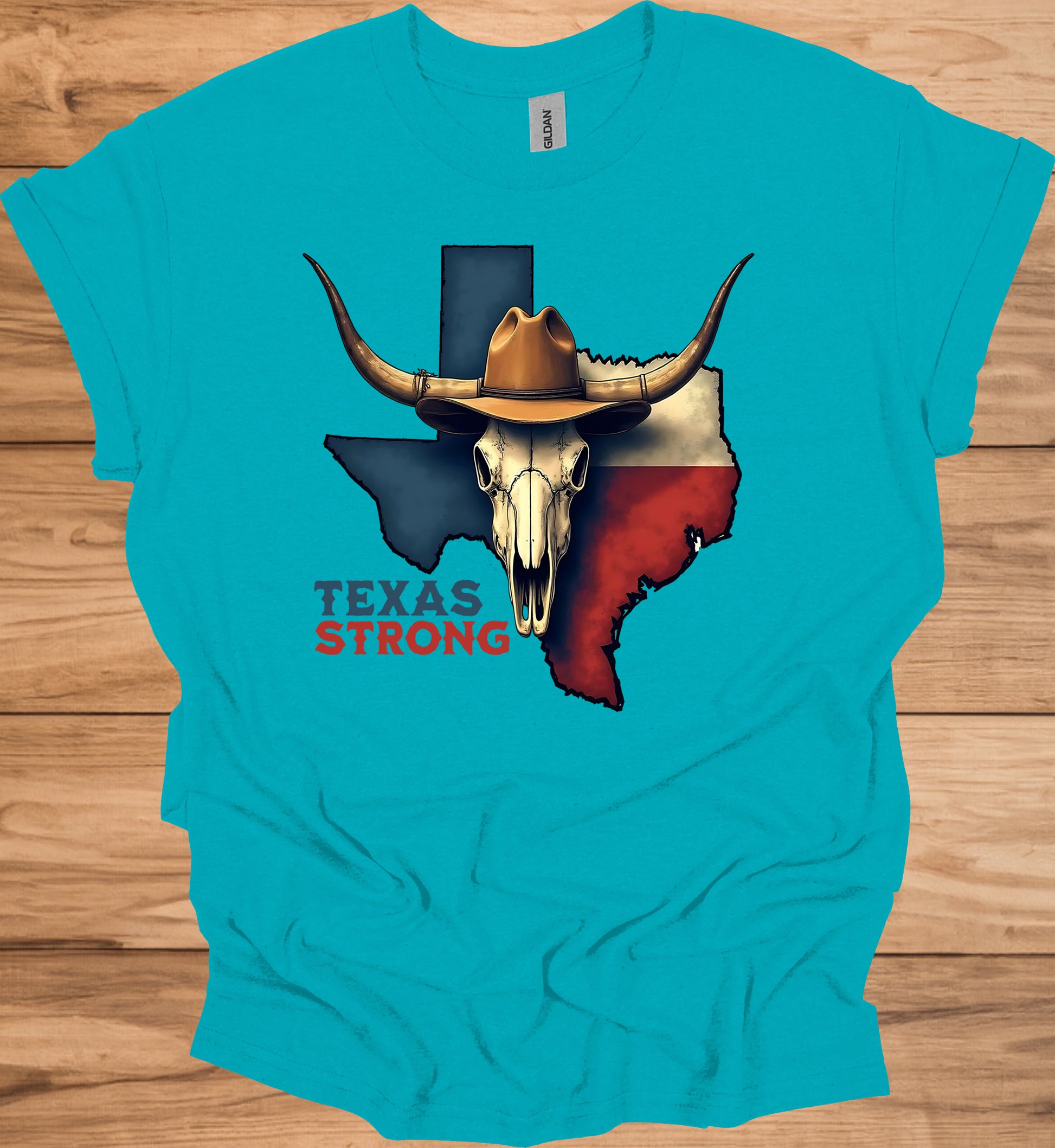 This striking image embodies the spirit of Texas with its bold iconography and patriotic color scheme. A longhorn skull adorned with a classic cowboy hat takes center stage, its impressive horns stretching across the frame. The skull rests upon a stylized outline of Texas, rendered in the familiar red, white, and blue of the state flag. "TEXAS STRONG" is prominently displayed at the bottom, with "TEXAS" in blue and "STRONG" in red, reinforcing the state's resilience and pride. The contrast between the weathered bone of the skull and the vibrant colors of the background creates a powerful visual impact. This design skillfully combines traditional Texan symbols with a modern, graphic style, making it an eye-catching representation of Lone Star State culture. The image would appeal to Texas natives, tourists, and anyone who admires the rugged individualism associated with the state. It effectively communicates strength, heritage, and a fierce sense of identity in a single, memorable composition.