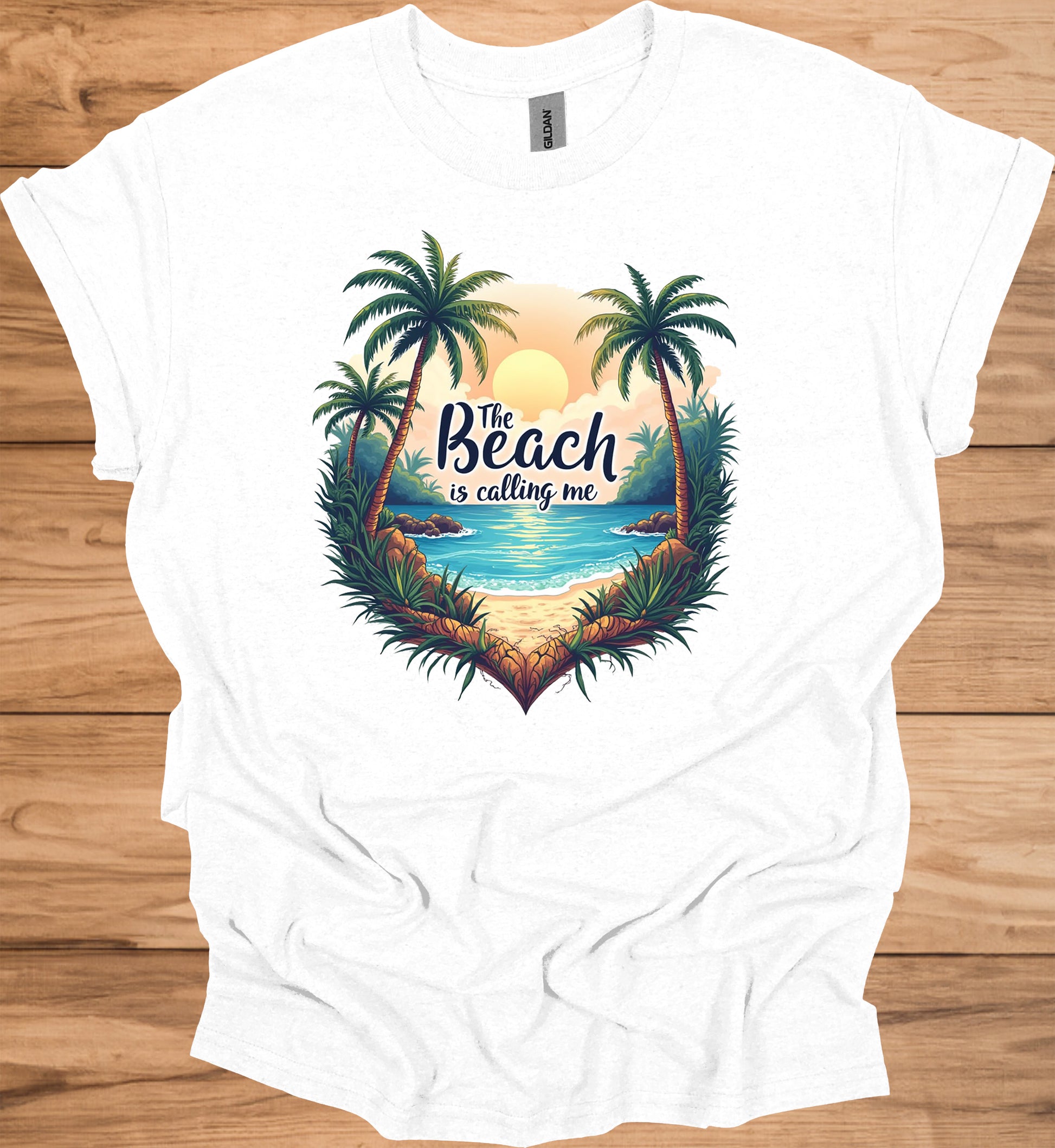 This vibrant tropical beach scene captures the allure of a seaside paradise with the text "The Beach is calling me" prominently displayed. Palm trees frame a picturesque view of turquoise waters and a golden sandy shore, creating a heart-shaped border around the central image. A warm sunset bathes the scene in soft orange and yellow hues, with the sun perfectly centered on the horizon. Lush vegetation in rich greens and browns surrounds the beach, adding depth and texture to the foreground. Rocky outcrops emerge from the gentle waves, hinting at the natural beauty beyond the shoreline. The illustration style blends realism with a touch of whimsy, evoking a sense of escapism and wanderlust. Subtle details like the reflection of sunlight on the water and the varied textures of the foliage enhance the image's visual appeal. This eye-catching design would be perfect for beach-themed merchandise, travel promotions, or social media content aimed at vacation enthusiasts and tropical destination lovers.