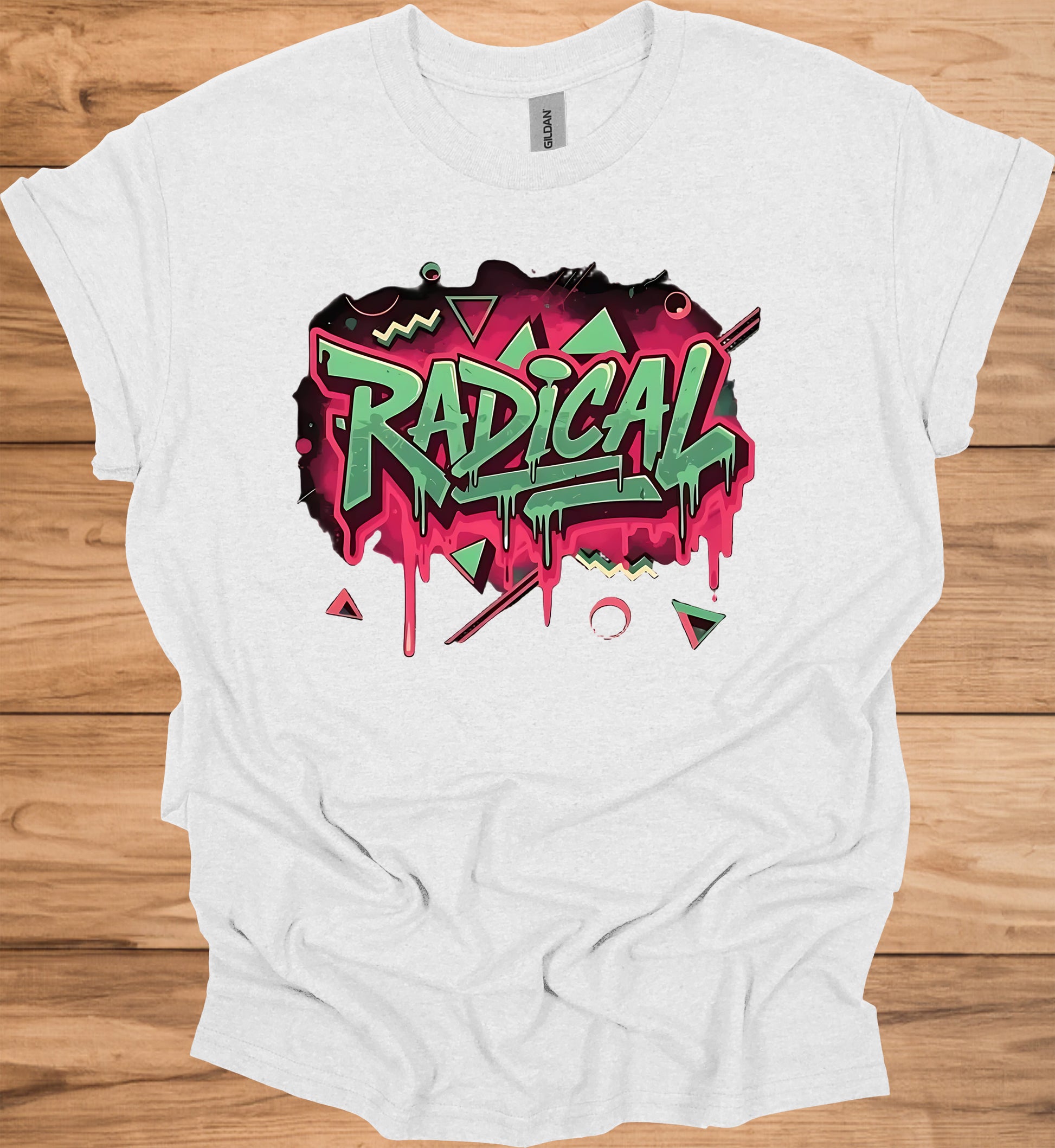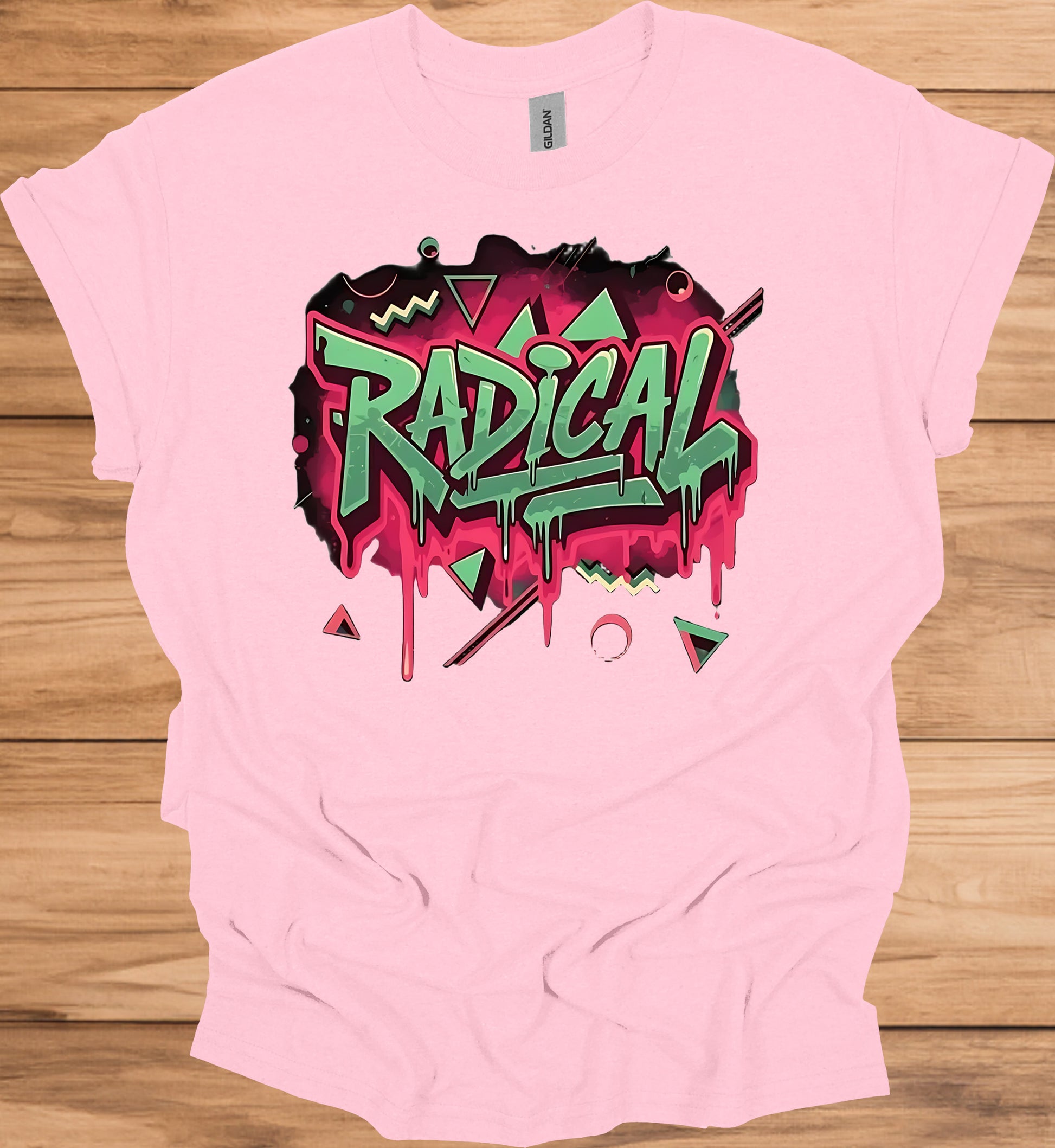 This vibrant graffiti-style artwork features the word "RADICAL" in bold, dripping green letters against a dynamic pink and black background. The design incorporates various geometric shapes like triangles and zigzag lines, adding to its energetic and edgy aesthetic. The letters appear to be melting, creating a sense of movement and fluidity within the image. The color palette, dominated by bright green and hot pink, gives the piece a striking, neon-like quality that immediately catches the eye. Abstract elements scattered around the main text enhance the overall composition, lending it a street art or urban culture vibe. The contrast between the sharp edges of some shapes and the liquid-like quality of the text creates an interesting visual tension. The entire design is set against a black backdrop, which makes the colors pop even more dramatically. This image would be well-suited for urban fashion brands, music events, or youth-oriented marketing campaigns looking to convey a bold, unconventional message.